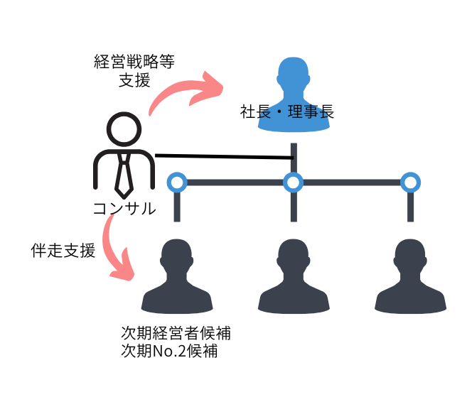 コンサルティングの支援はその場しのぎの依頼ではなく、中長期的な人材育成に使うことができます。事業推進を次期No.2と共に行うことで、実践的な実力がついていきます。